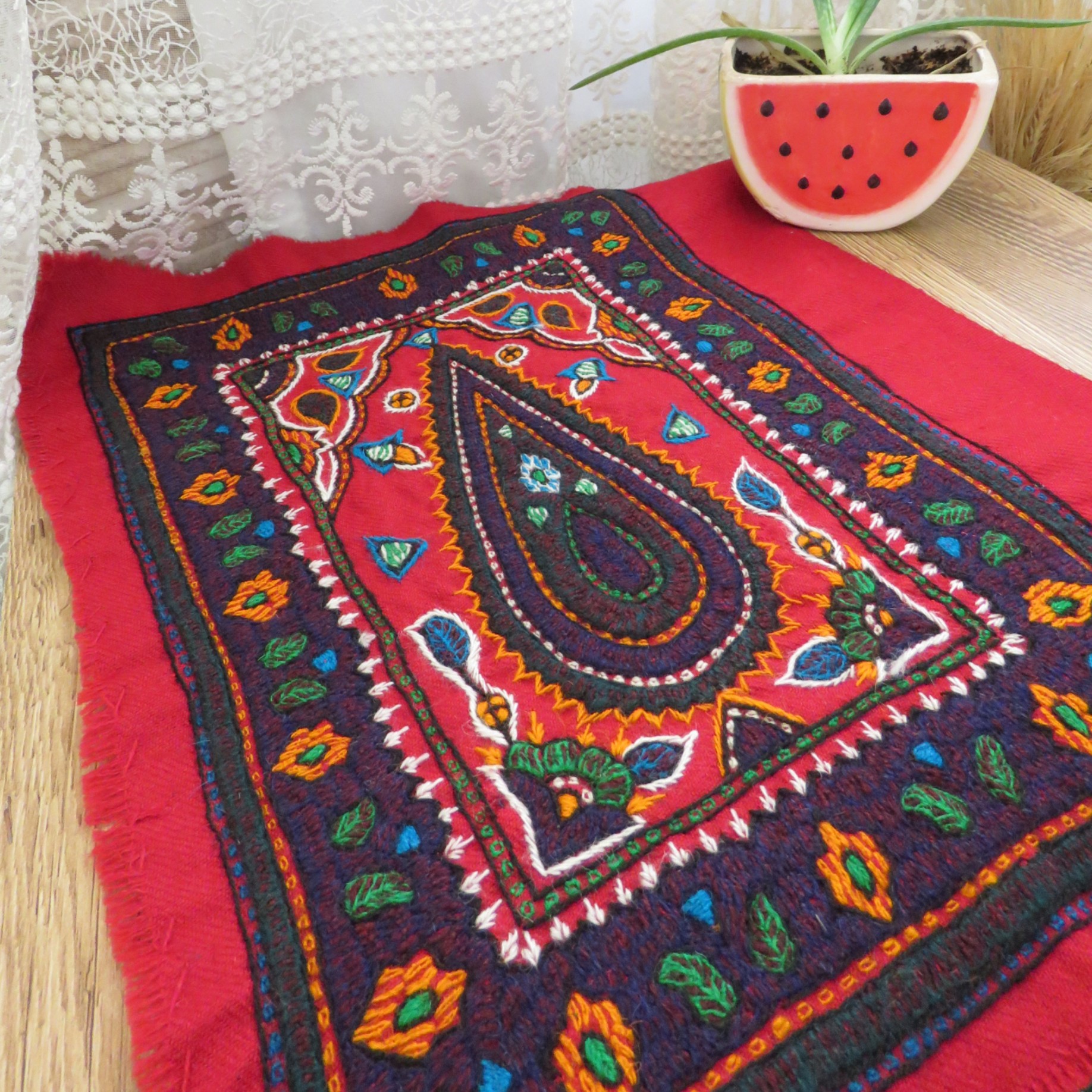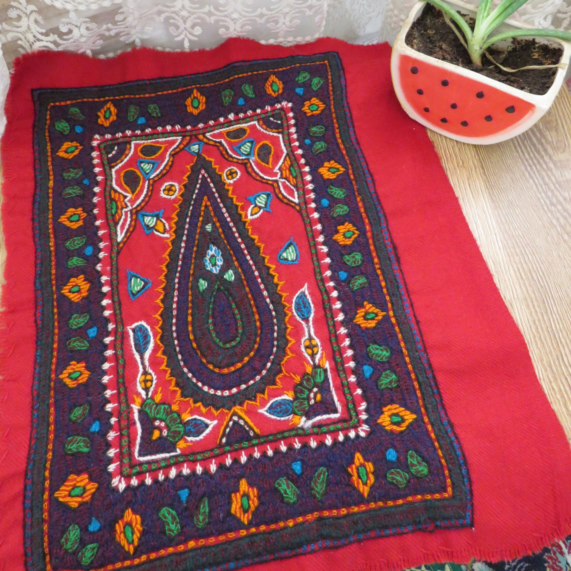 دست دوز، اندازه قسمتِ سوزندوزی شده ۴۲ در ۳۰سانتیمتر،کل پارچه ۴۷ در ۳۶ سانتیمتر بدون آستری،