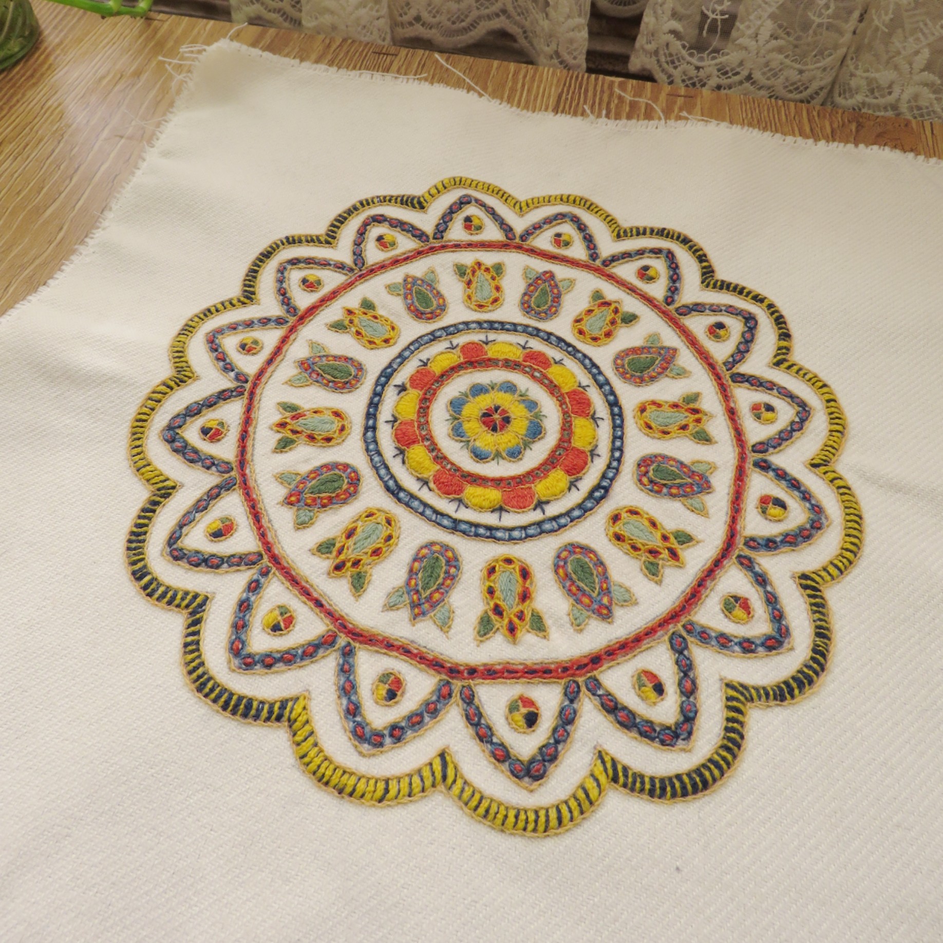دست دوز،دوخته شده با نخ گیاهی،قطر سوزندوزی ۲۲سانتیمتر،حدود ۵سانتیمتر برای فضای ریش ریش اطراف، به دلخواه شما با هزینه ۱۵۰هزار تومان قابل آسترکشی میباشد.رومیزی یا زیربشقابی پته،دیوار کوب پته دوزی